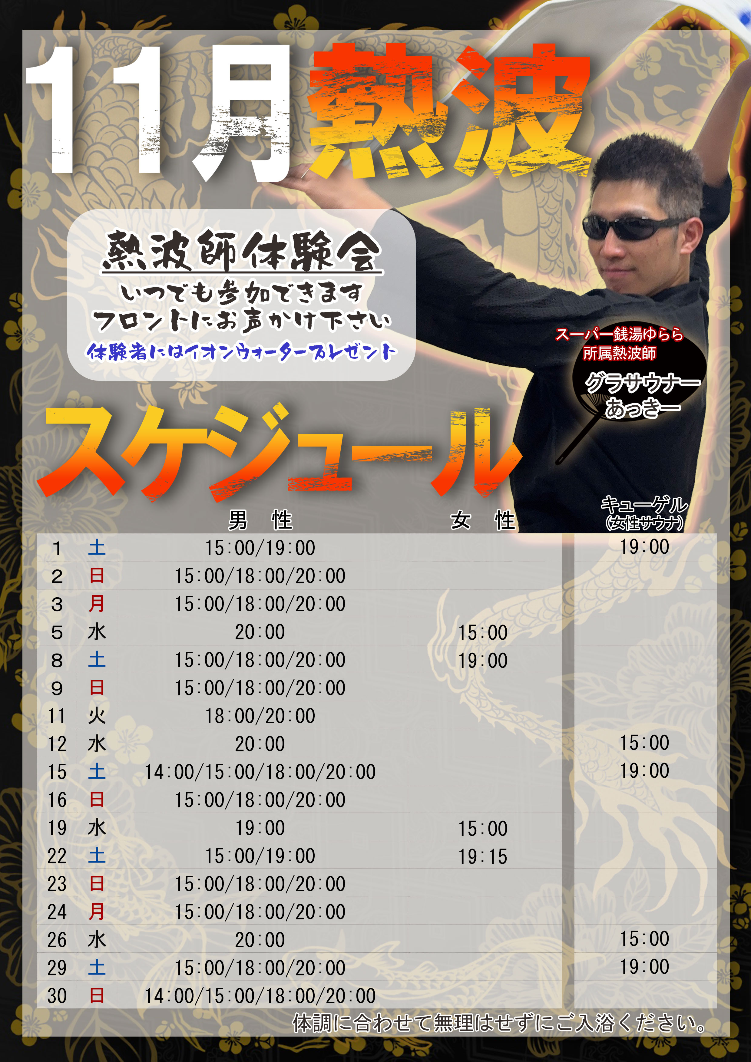 11月のサウナイベントスケジュールです。 体調に合わせて無理はせずお楽しみください。